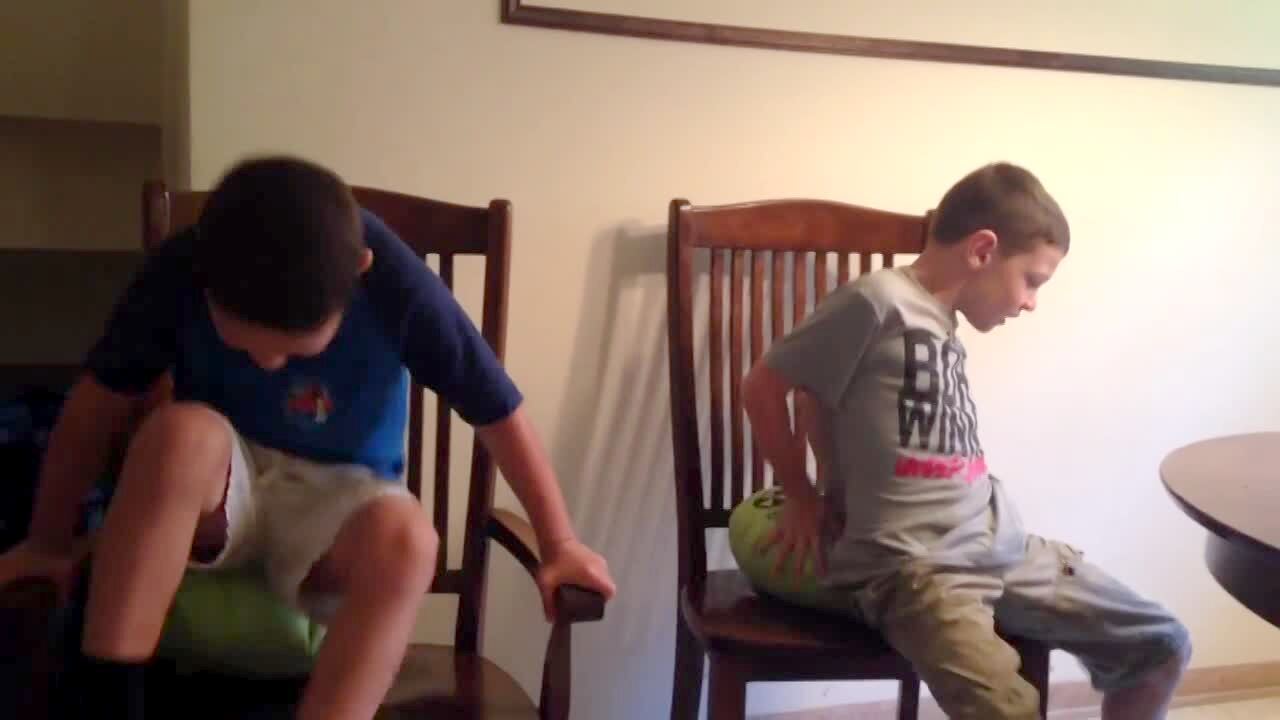 Woman shakes her butt to shake golf balls out of tissue box strapped to her back in living room, she falls down. Weird game.