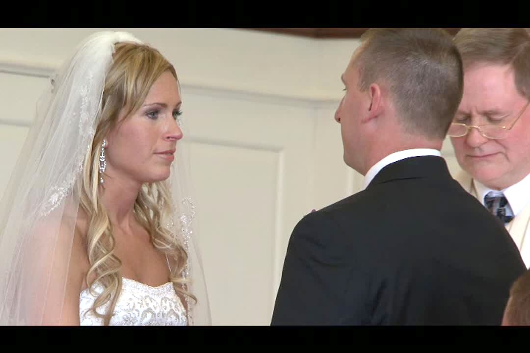 Senior man and woman walk in the door for a surprise anniversary party. Woman faints and other people catch her.