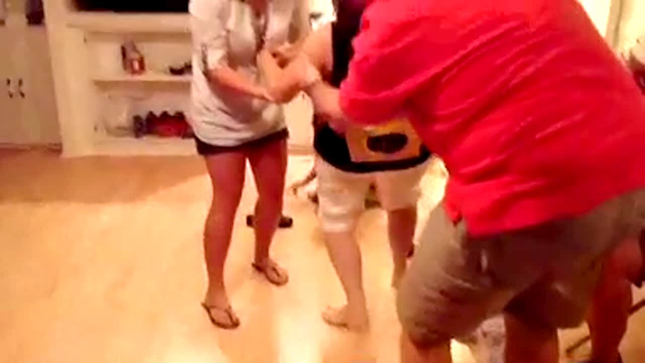 A woman dances on a table at a party and falls off of the table. Drunk?
