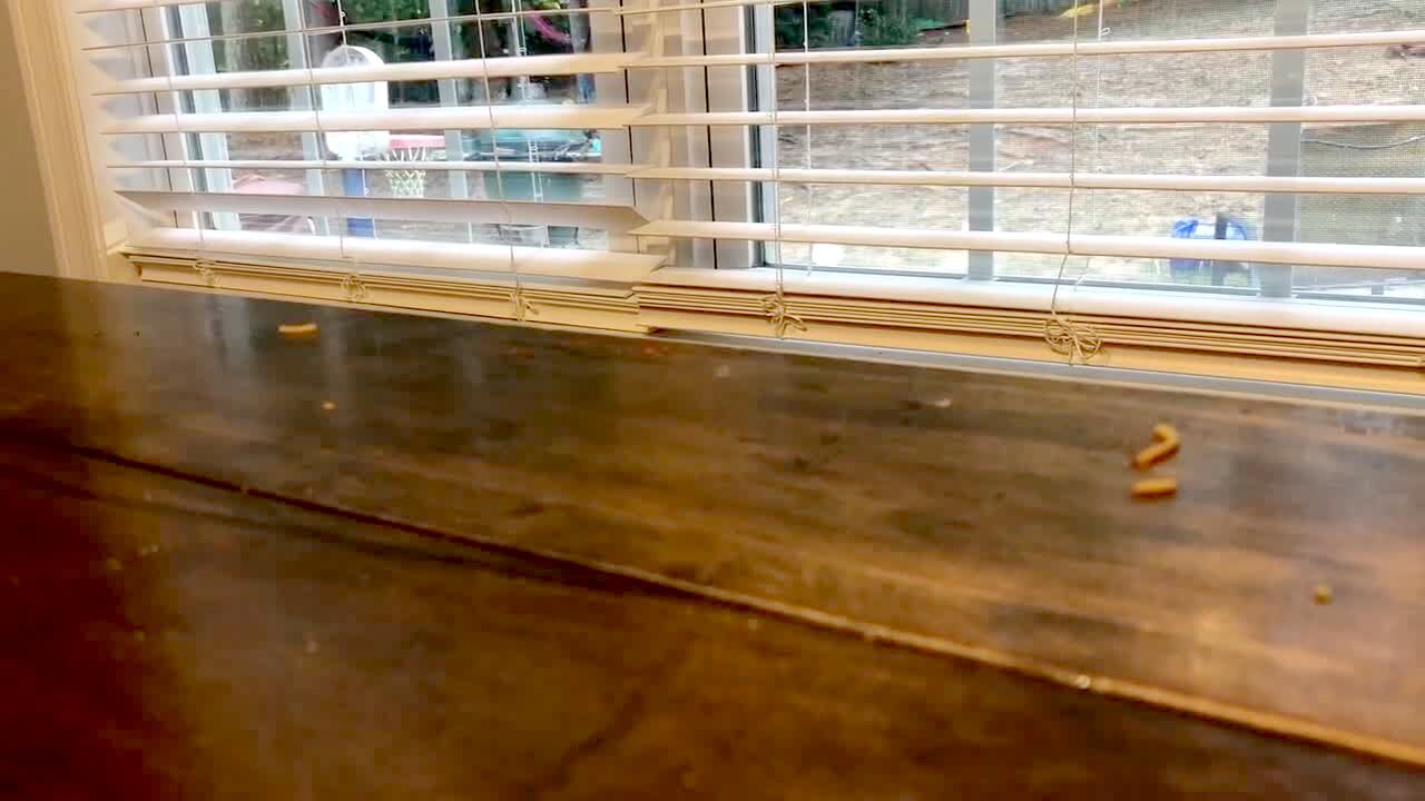 A young girl gives her Golden Retriever dog a piece of bacon as he wears a dinosaur mask in the house, and when the dog chews the mouth of the mask moves.