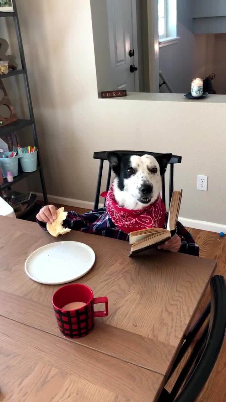 A dog with human hands sits at a table and eats peanut butter off of a spoon.