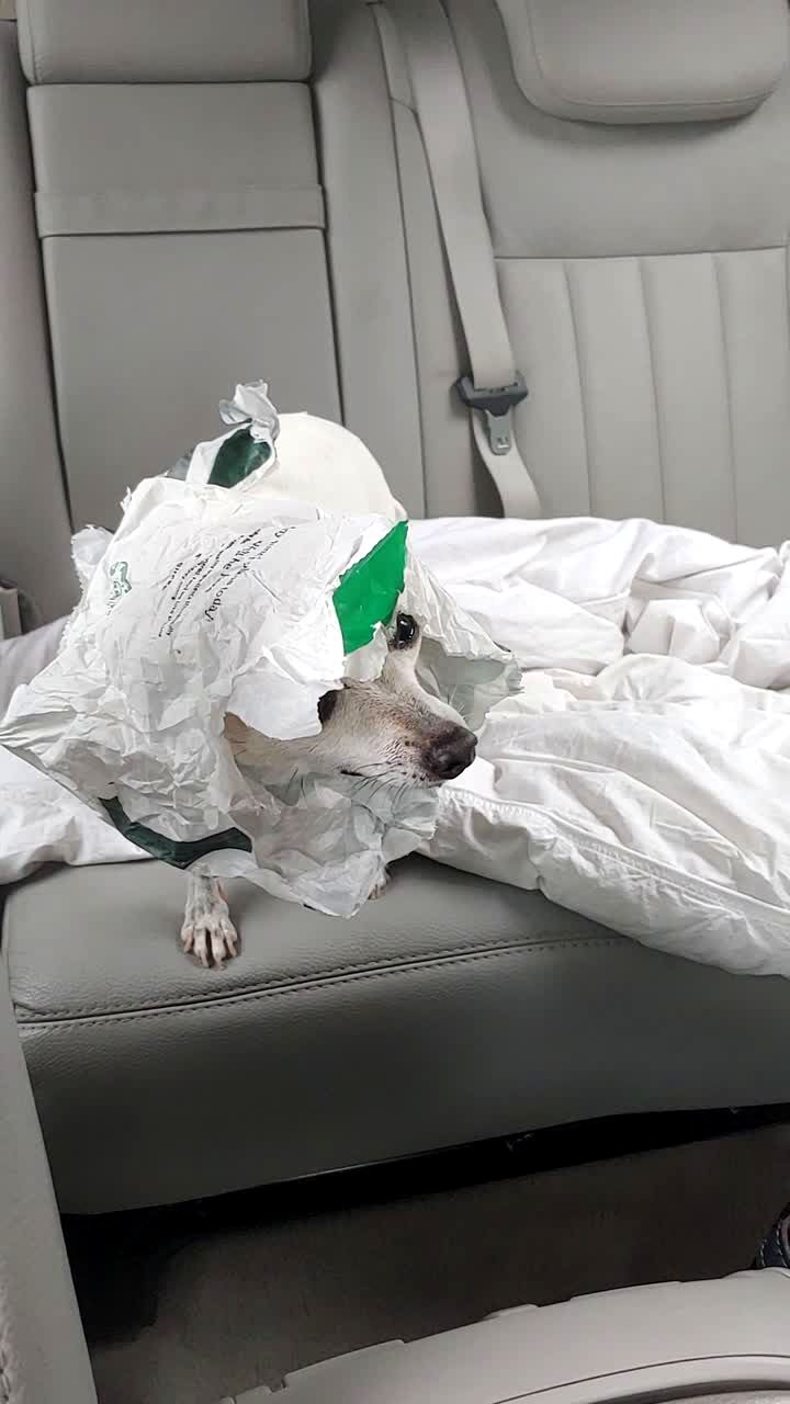 A woman laughs when she sees a Chihuahua dog with its head through an empty bag of scones in the car.