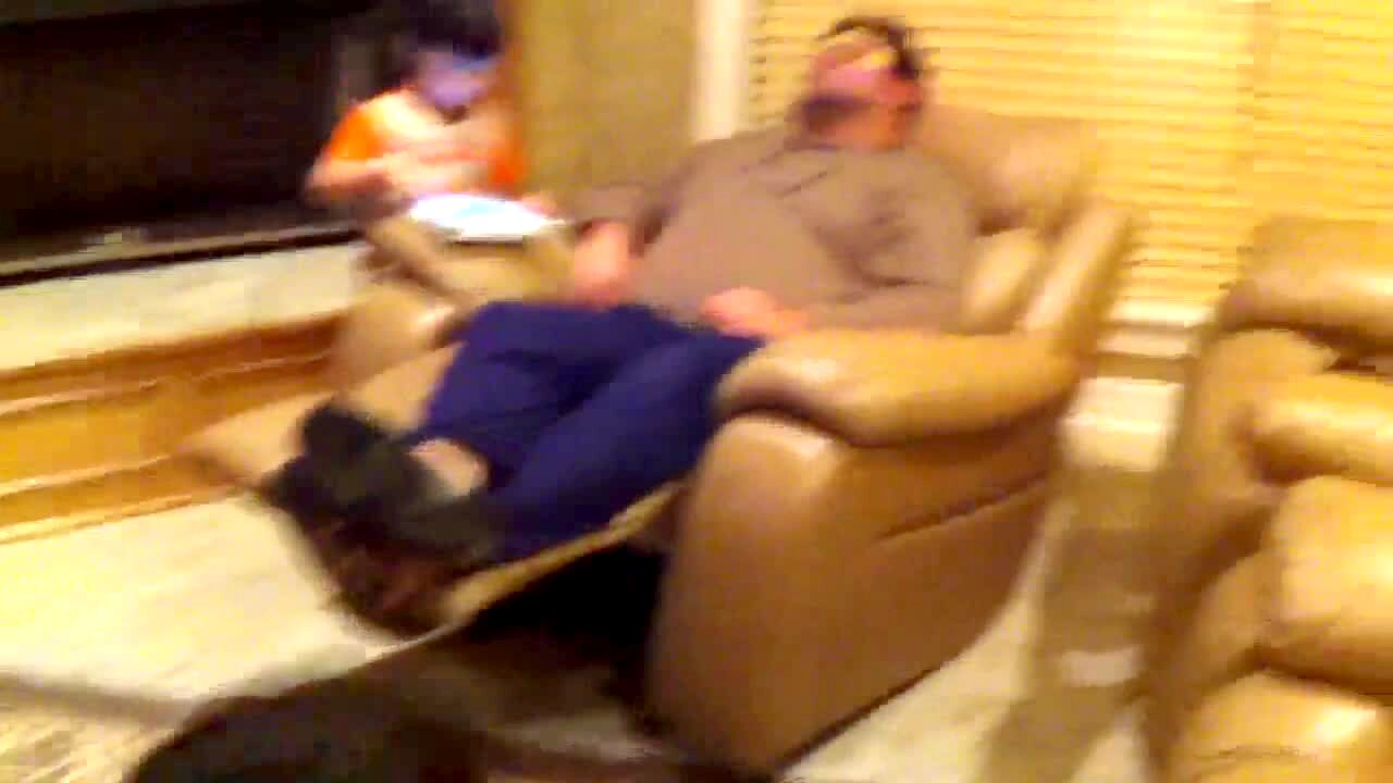 Giant remote control spider crawls out from under the TV in the living room and scares young boy. Dad is controlling it. Practical joke.