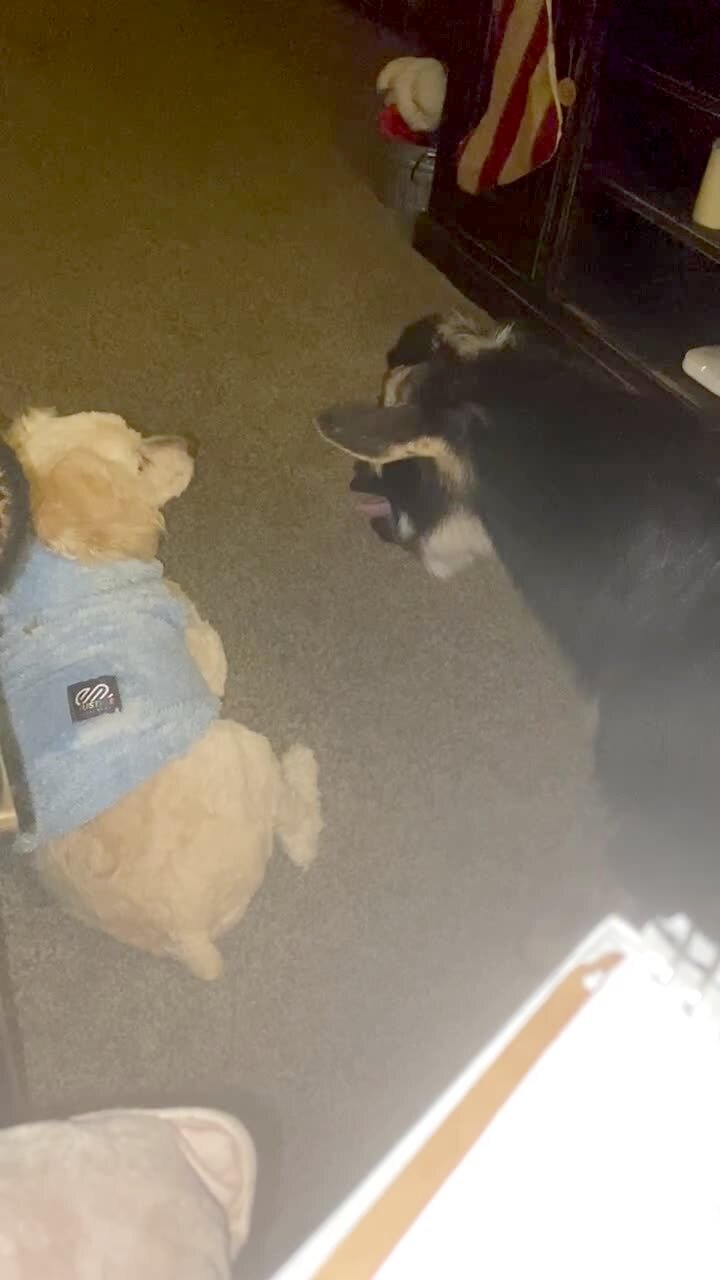 A puppy dog runs full speed into a glass door on a porch. Security footage.