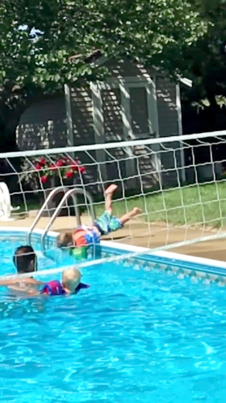 Tot boy jumps off the backyard playground set onto a slide, he bounces off the slide and hits his head on the fence. (2103)
