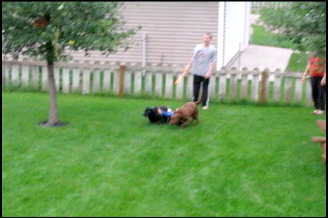 A man in the backyard reverses and drives a toy car while a young girl tries to remember the phone number for the police. The car flips backwards and the dad falls out.