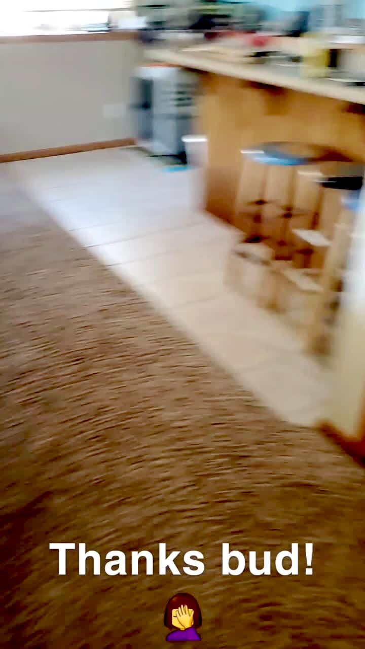 A young girl dances in the kitchen. A man runs and slides on the floor in front of her and hits the counter and falls. Music rights not cleared.