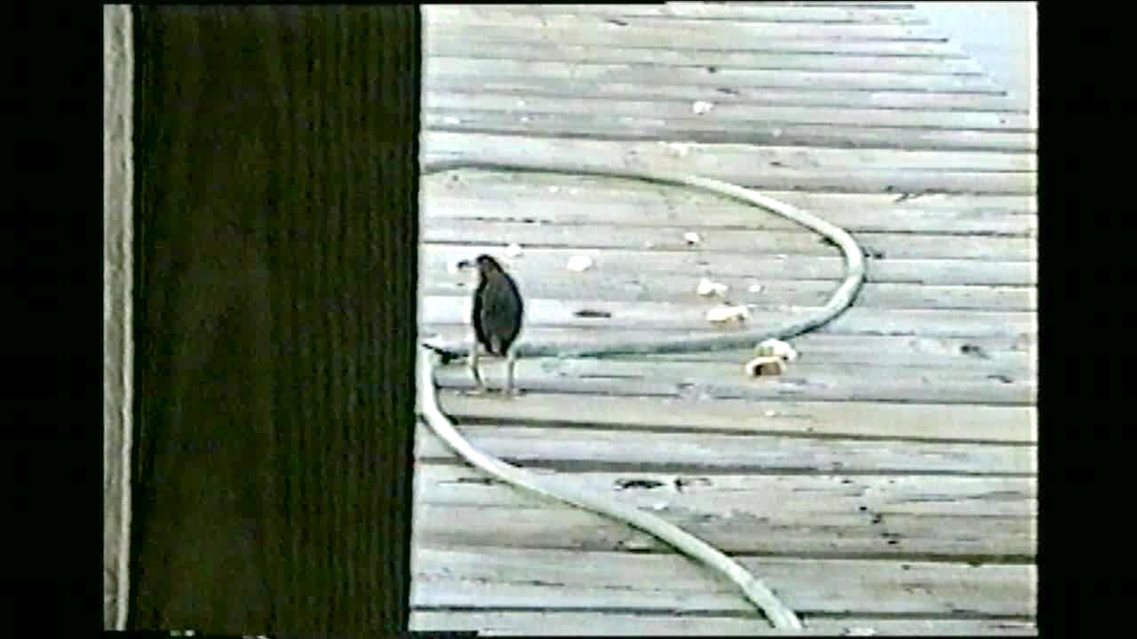 Bird takes bread from pier, throws it into the water, uses it as bait to catch fish. Small fish comes up & the bird jumps in. Smart.