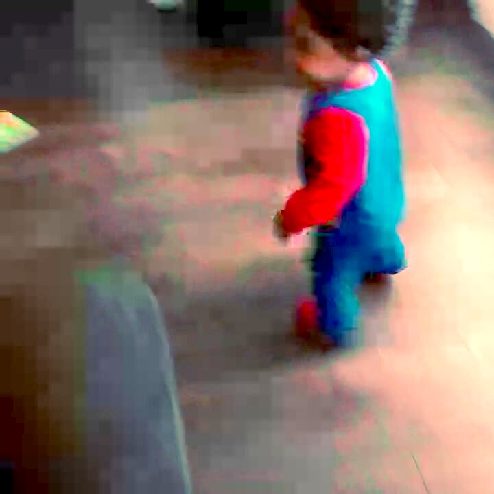 A woman films a baby boy at home, then it sounds like the baby boy says "can you back up?"