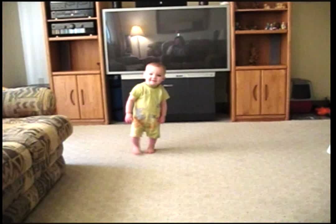 A woman aks 'Where's Jonah' in a living room. A tot boy, Jonah, jumps up and smiles at the camera each time. The third time he jumps, his head smacks the woman in the face and hurts her. The boy laughs.