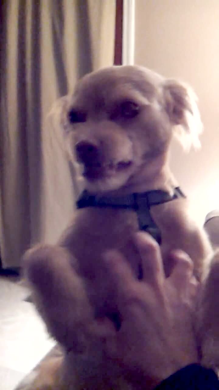 A woman pets a Chihuahua mix dog and tells her to "show us your pretty smile" in the house. The dog sits upright then snarls at the woman.
