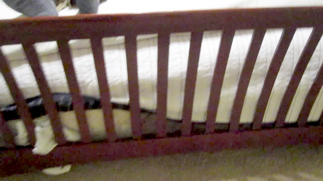 Tot boy hits a Jack in the Box toy on dad's lap in the living room with a bat, he hits Dad's groin / crotch.