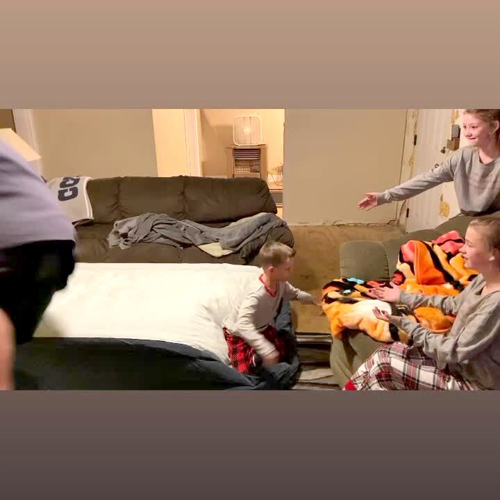 A young boy in a living room sits on an air mattress and a man jumps on the mattress and the boy flips and flies into the air and lands on a couch.