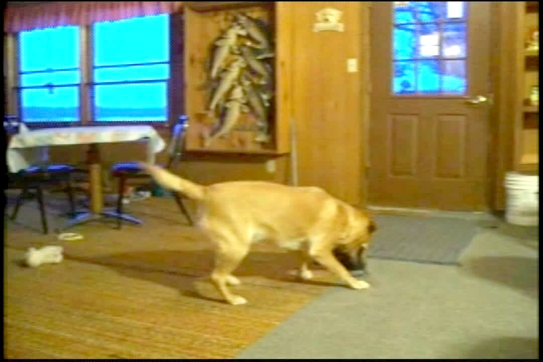 Lab dog holds the shoelace of a boot in his mouth and spins in circles, whipping the boot around in the air.