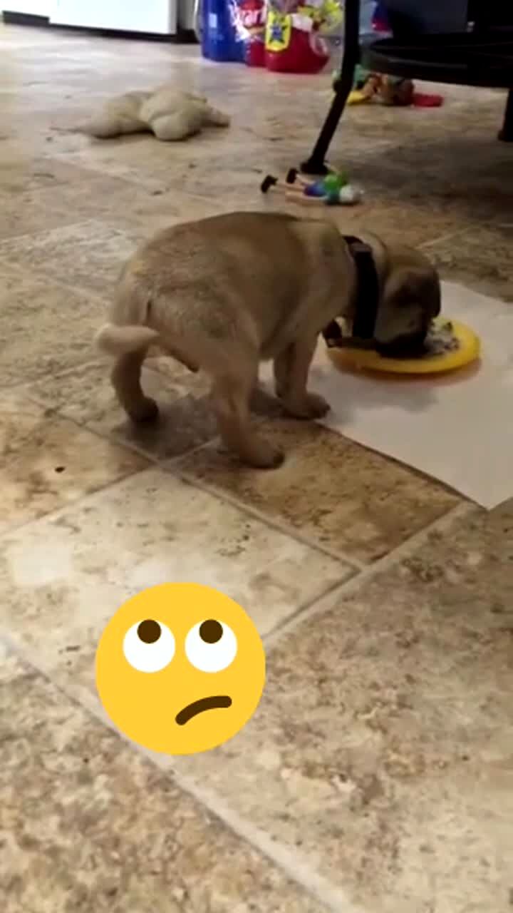 A puppy dog's hind legs raise in the air and it flips over while it eats off a plate on the floor. Emoji added to video.