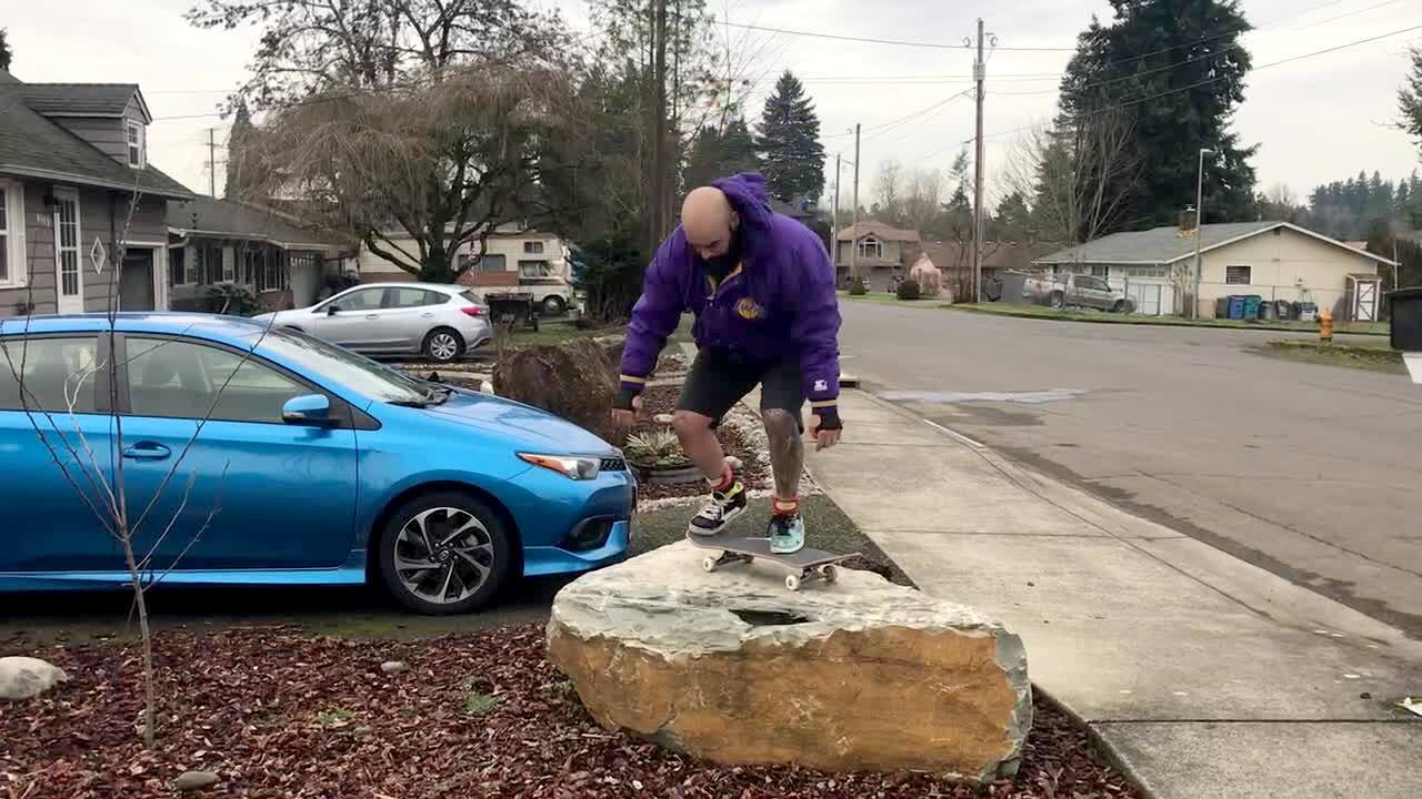 A man tries to do a kick flip on a skateboard on top of a rock and he flips and falls backwards.