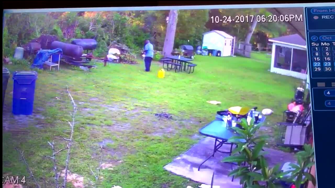 A man pours gas from a container onto a firepit and the cannister catches on fire and he throws it into the front-yard and gas spills on the lawn and catches fire and he walks over and kicks it to the driveway and slowly walks off-camera. Security footage.