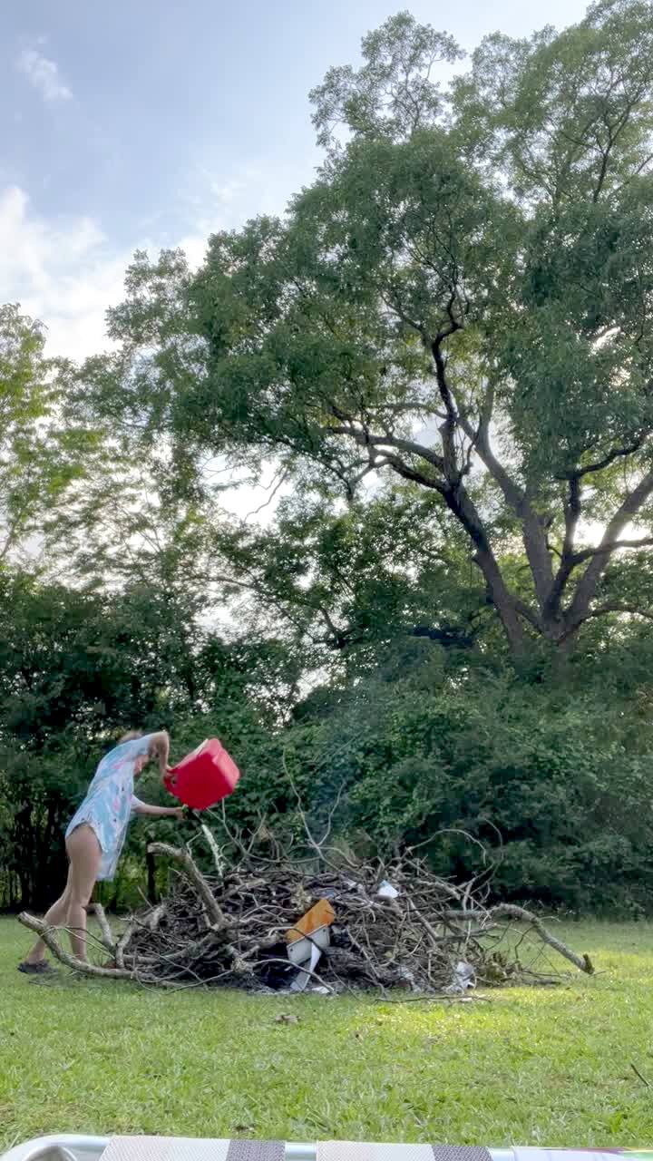 A teen girl pours gasoline all over tree branches outside, then she lights it on fire, but the fire takes a second to spread, and she jumps back when she gets too close to it. Dangerous.