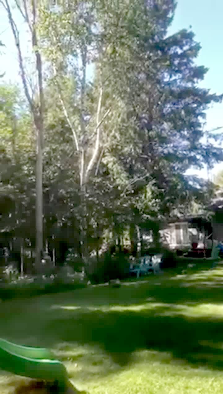 A man cuts a tree, then it falls down and crushes a playset in a yard.