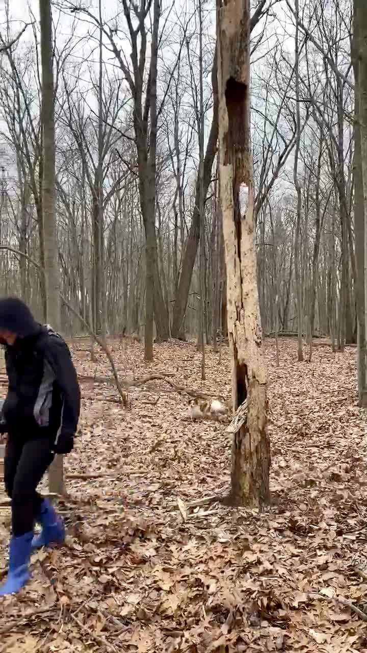A woman kicks a rotted tree in the woods until it falls and part of it hits her head.