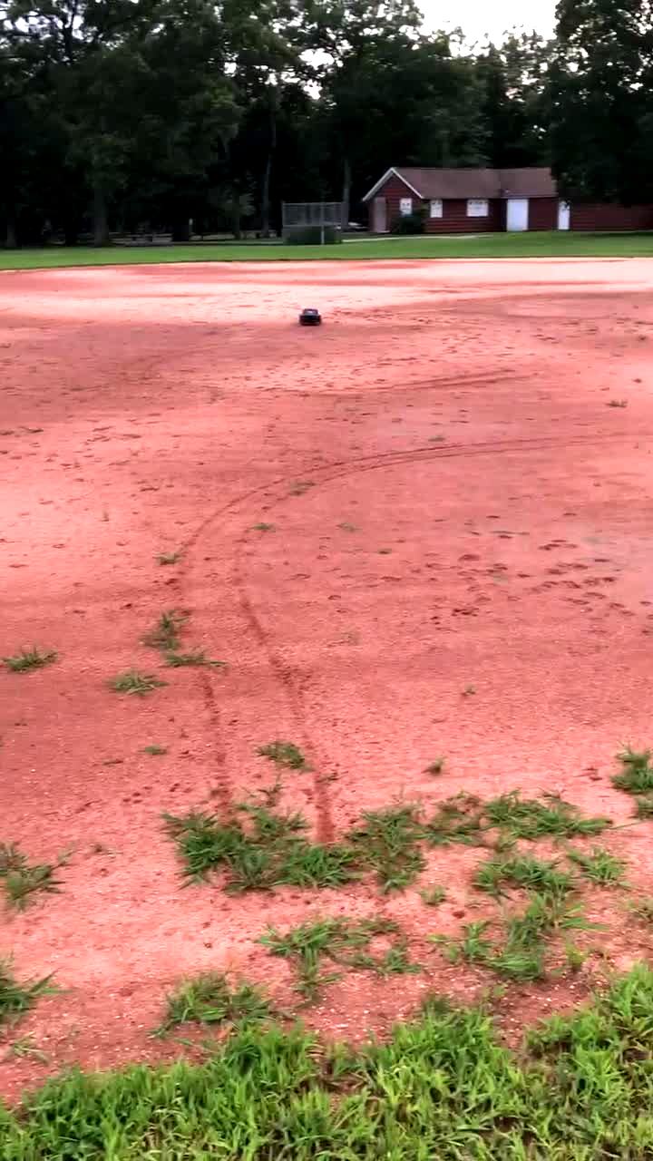 A tot boy drives a remote control car at a park. The woman behind the camera yells when the car drives into her feet and knocks her over. First person POV.