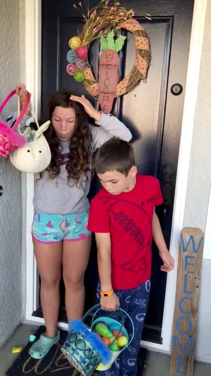 A teen girl and young boy do the Borrowed Hands Challenge to put the girl's makeup on, and the girl laughs as it gets all over her face.
