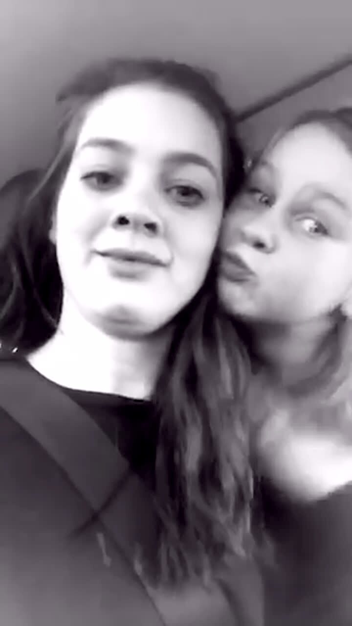 A teen girl takes a selfie with her younger sister then the young girl leans in for a kiss and the teen sister pushes her face away and her head hits the roof of the car and she falls back.