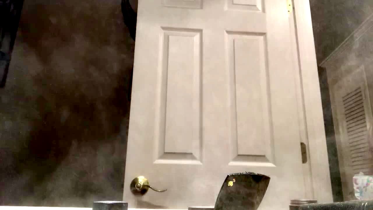 Two young girls make a makeup tutorial in a bathroom, then one of them blows into a container of loose powder, and they both cough and leave the room when a cloud of powder covers them.