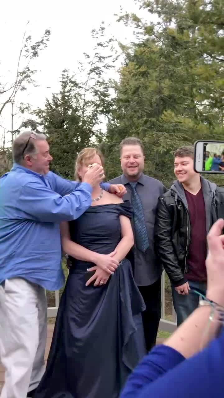 A man smashes a cupcake in a woman's face while they pose for a family photo on a deck, then she gives it back to him and smashes a second cupcake in his face.