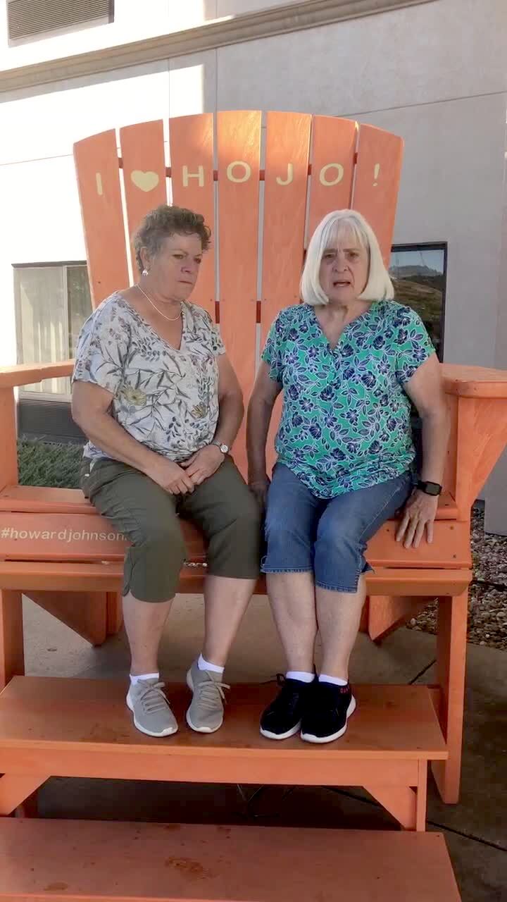 A woman behind the camera tells two women on a large lawn chair to slide back, then they slide all the way back into the chair.