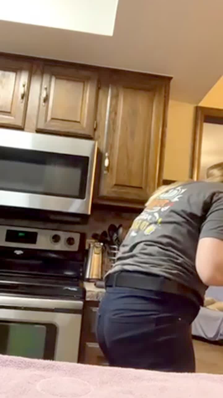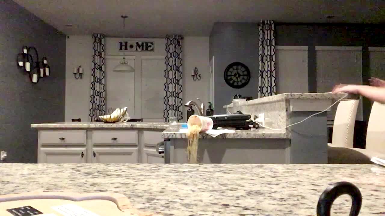 A woman shotguns a beer in the kitchen when it splashes over her shoulder into the face of a younger woman standing behind her. Social media video.