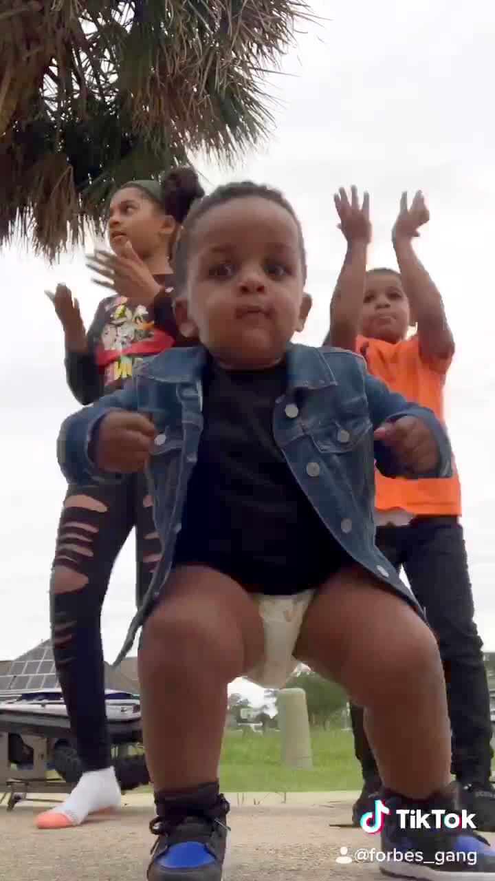 A young girl and young boy dance in a road and an even younger boy in a diaper walks in front of the camera and dances as well. Music rights not cleared.