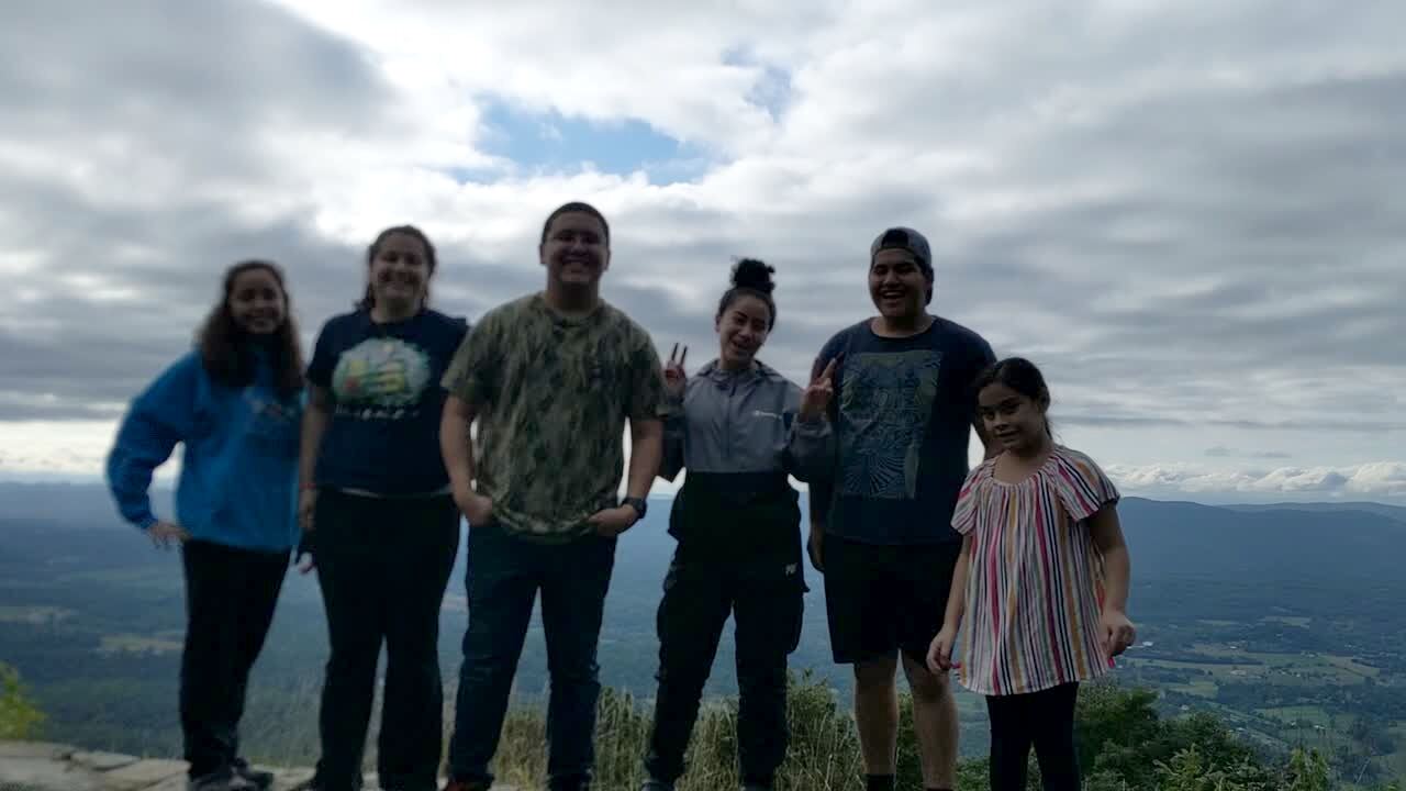 Two teen boys, three teen girls and a young girl stand on a mountain and pose for a picture and one of them falls down.