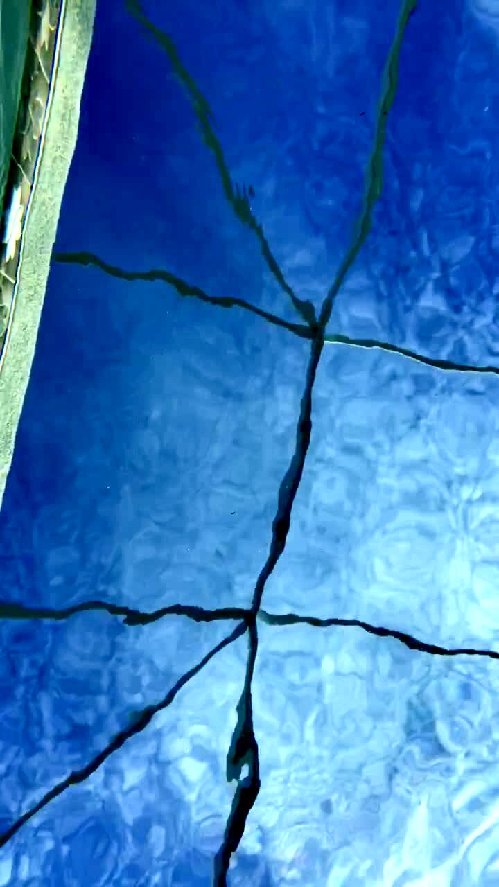 A camera continues to record after a young boy knocks it off of a table into a backyard swimming pool. First person POV.