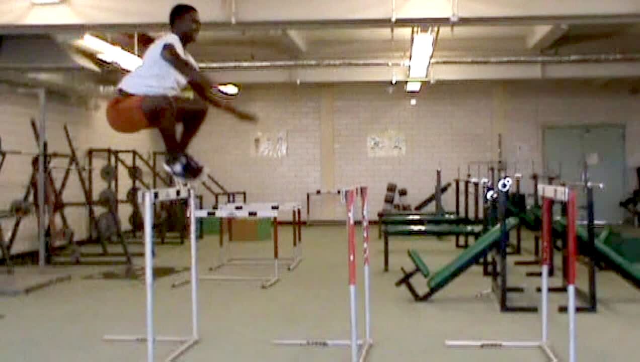 Teen boy tries to jump hurdles in the gym, he hits himself in the groin. Crotch.