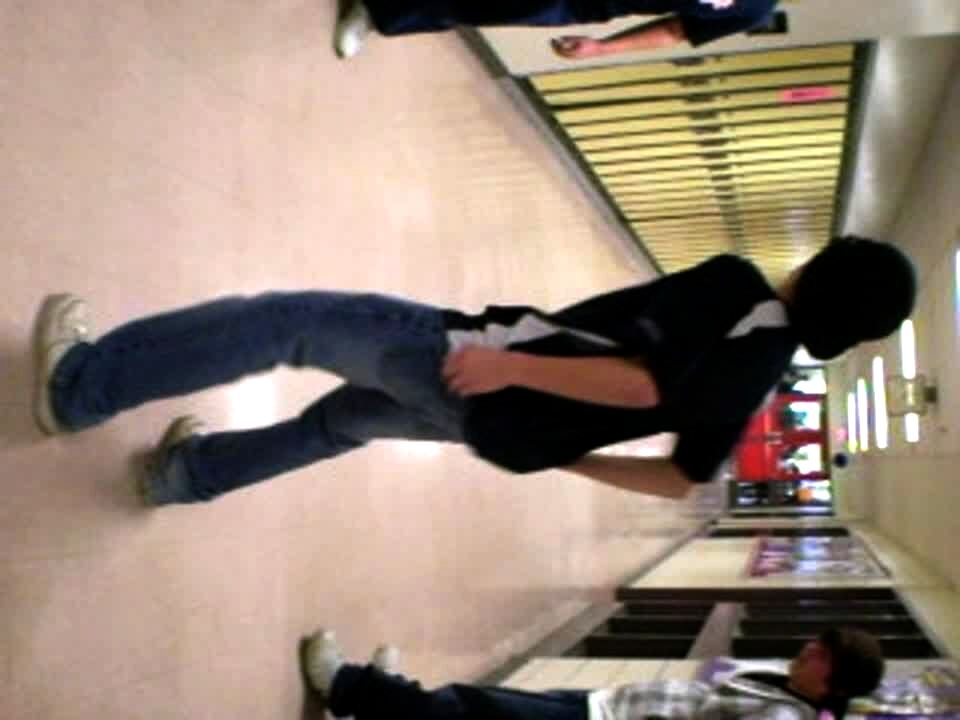 Teen boy does a cartwheel in school hallway and runs into a locker. Video shot sideways.