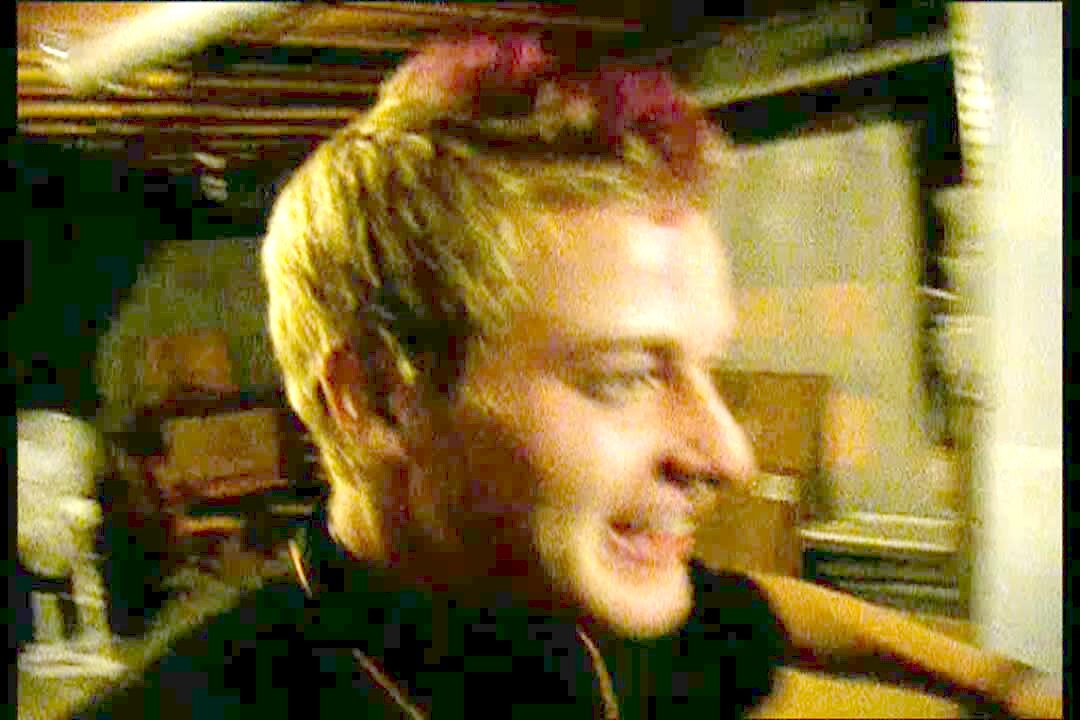 Teen boy runs on a treadmill, does tricks lifting himself up & spinning around. He slips and falls down & hits the wall behind him, making a hole. Dark room.