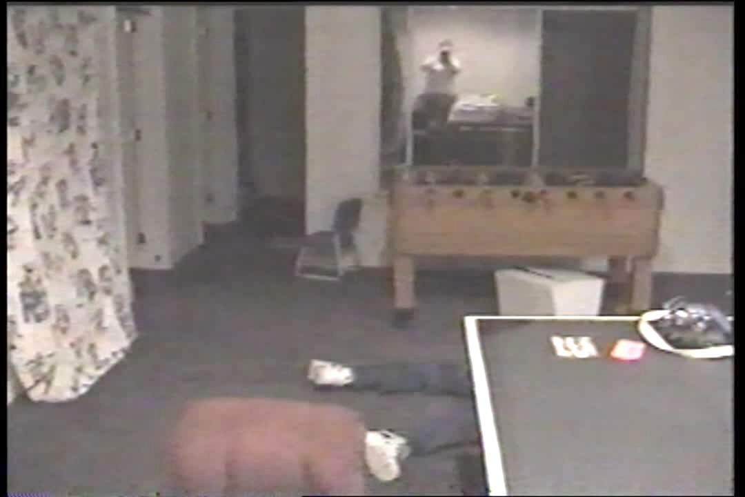 Teen boy runs down college dorm hall in big cardboard box, trips and falls hard over his friend. Bonehead.