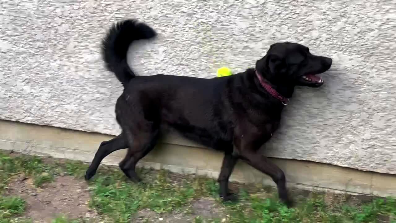A Chihuahua dachshund dog shuffles its paws back in forth when it runs out to the backyard with a toy.