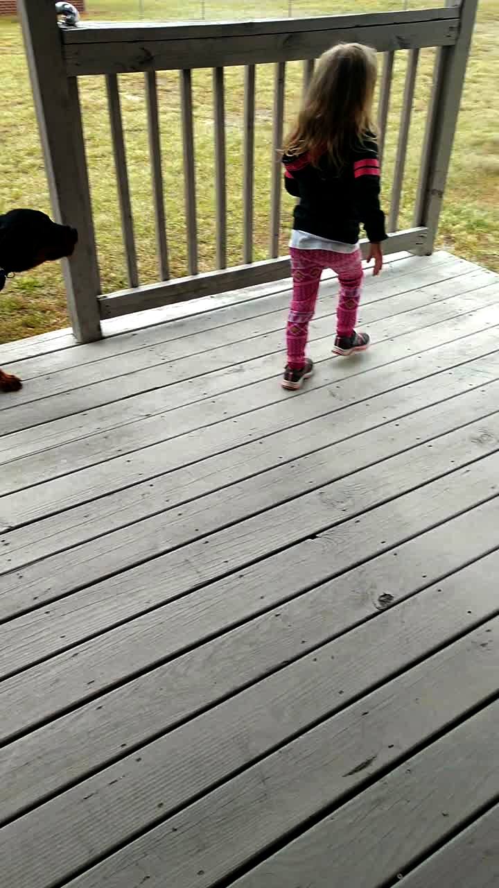A tot girl and a dog jump off a back deck, and the dog knocks over the girl.