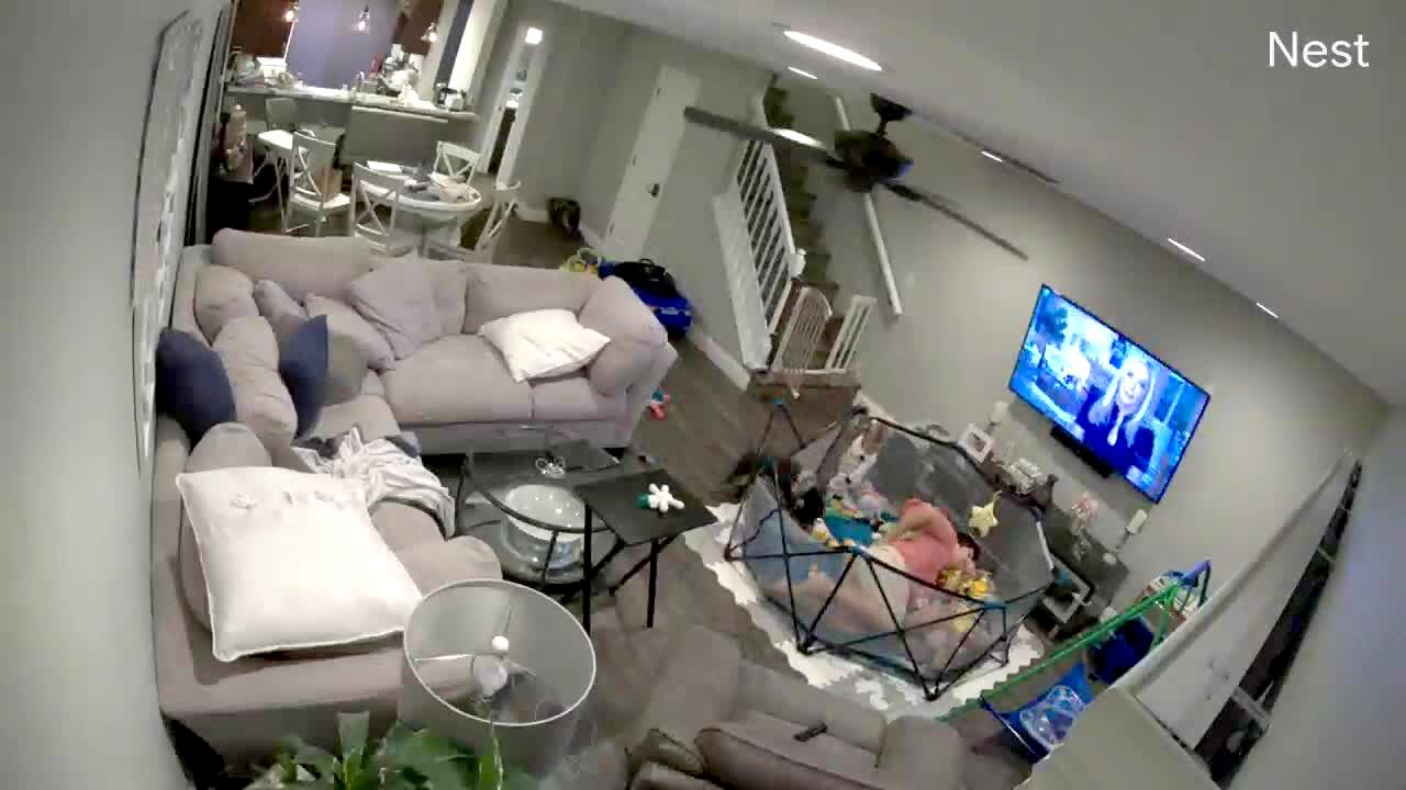 A dog runs into a mesh camping tent and knocks it over onto its side. Security footage.
