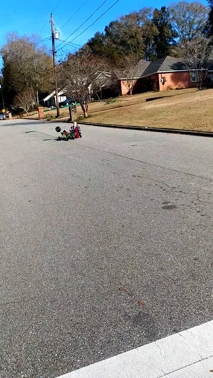A woman sits in a toy car as her family pulls her behind the real car, and drive down the street. The toy car crashes into a satellite dish, and falls apart.