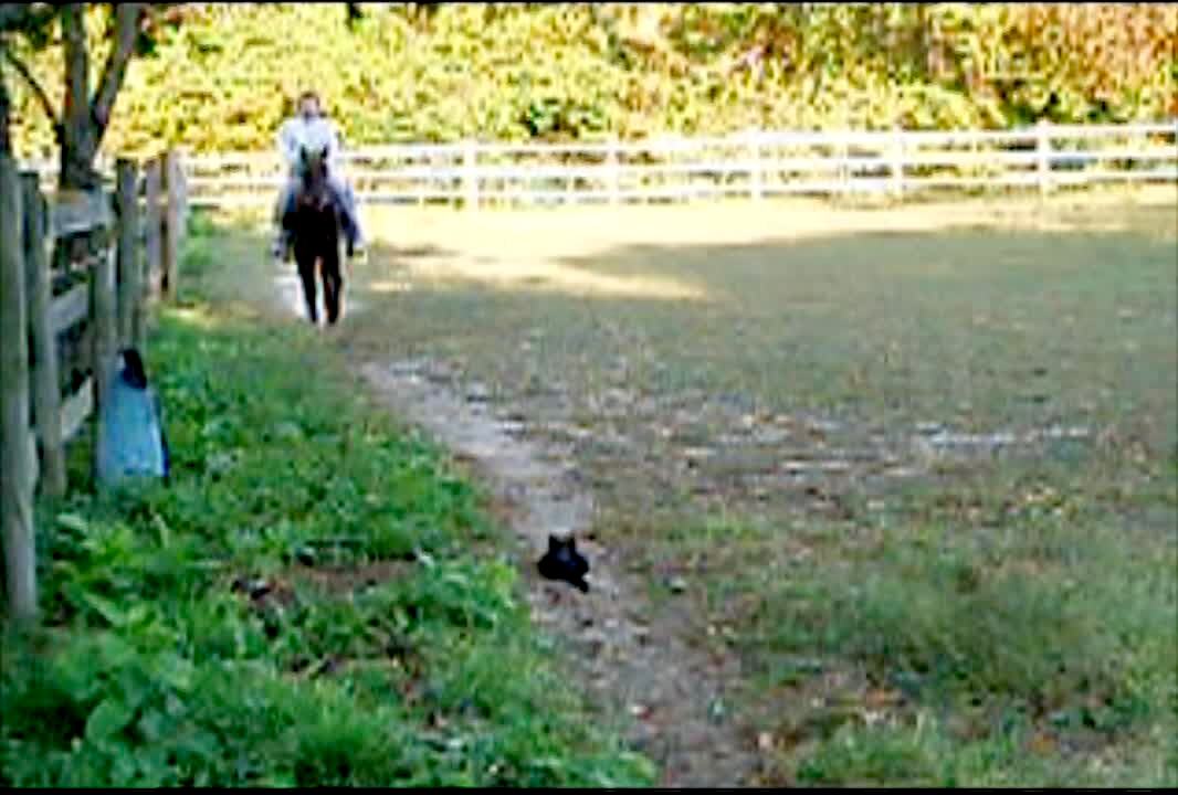 Tot girl slowly approaches black cow laying in field, cow nudges her to the ground with its nose, girl cries. Farm.