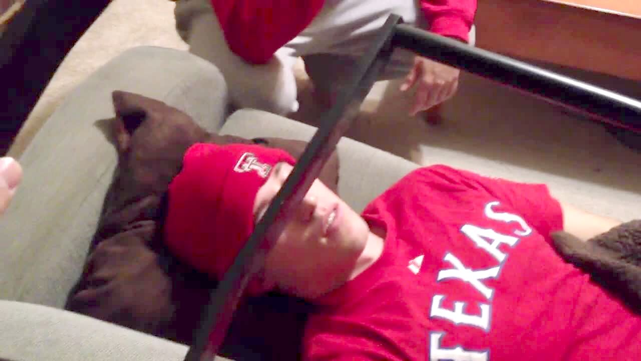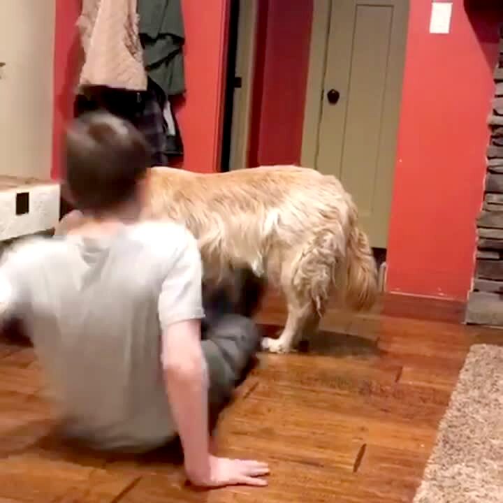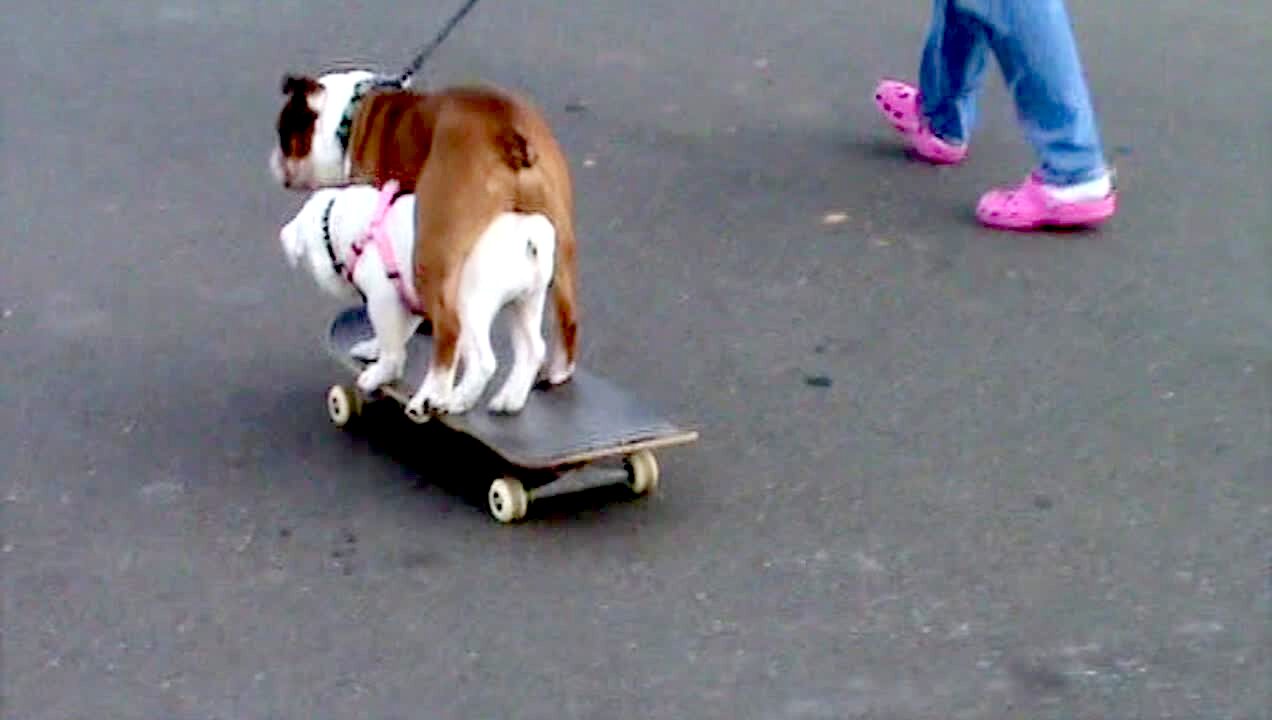 "Sit-Up Pup" A teen sits on the floor and holds a bull dog's legs while he's on his back. The dog does sit ups, while the people around him cheer him on.