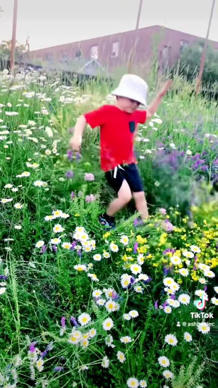 A young boy apologizes and excuses himself as he walks through a hillside filled with flowers