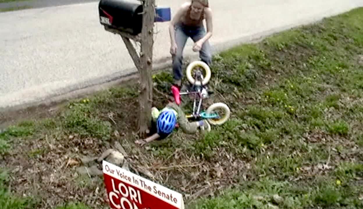 A boy pedals a bicycle around on a street while his mother pushes him. He gets away from her and falls down, crashing into a mailbox. He starts to say that he needs three bandaids and then corrects it to four.