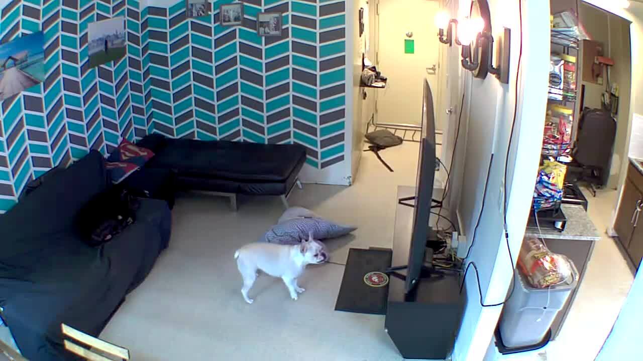 A man drives a lawnmower in the backyard, and bumps into a wall. He steps out of the lawn mower, then it continues to drive away as he chases after it. Home security footage.