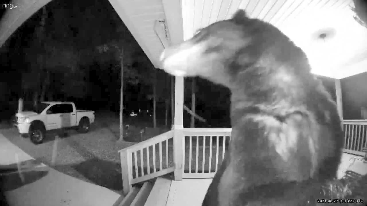 A man burns small tree branches in a barrel in a yard and it explodes and a burning branch lands on his head. Short head. Security camera.