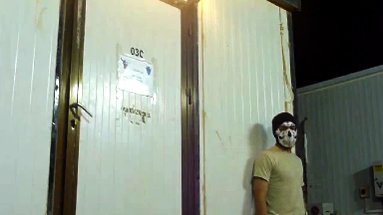 Male soldier wearing a scary mask knocks on friend's door at the military base, scares him when he opens door. Practical joke.