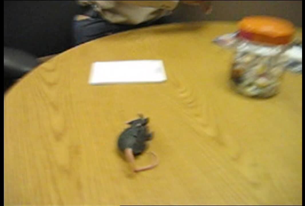 A woman sees a fake mouse toy in a room at work and screams and runs.